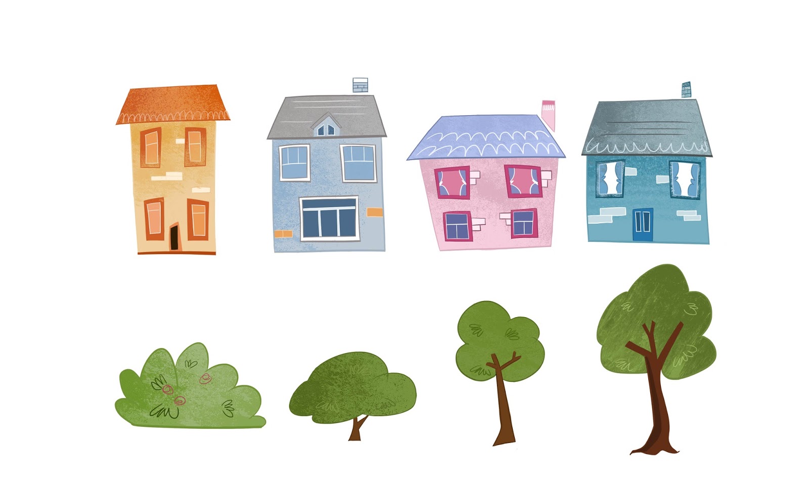 These are a few props of trees and houses that would be in the backgrounds with the added Janet Bell twist.